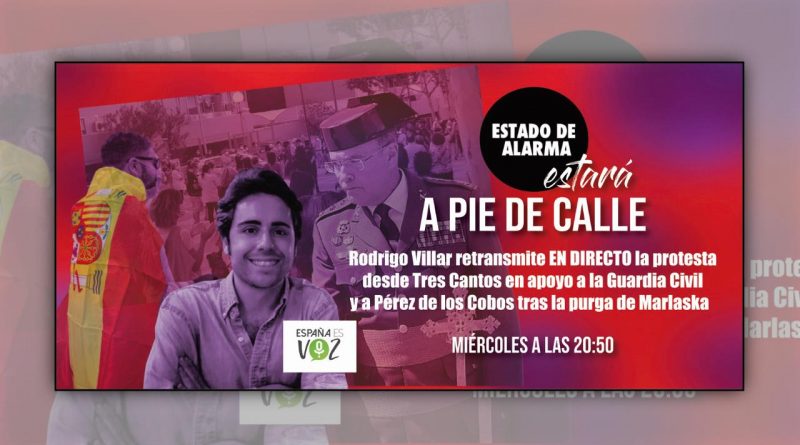 Nuestro director Rodrigo Villar estará hoy en Tres Cantos frente a la Comandancia de la Guardia Civil retransmitiendo las protestas para el programa Estado de Alarma. Estaremos apoyando también a la Guardia Civil y a los vecinos que libremente se manifiestan en contra del Gobierno de Sánchez y en contra del ministro del interior Grande-Marlaska que destituyó al coronel Pérez de los Cobos por estar cumpliendo con su deber.