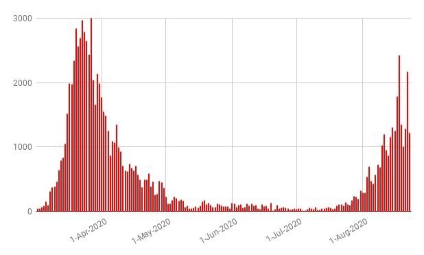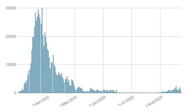 Parece claro que la primera es tremenda, porque nos está diciendo que se está llegando a los contagios diarios habidos durante el estado de confinamiento, mientras que la segunda nos indica claramente, que, aunque están subiendo los contagios diarios, están muy lejos de las cifras que sufrimos durante el confinamiento ¿Conforme?