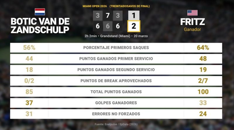 En terminos practicos, Botic van de Zandschulp 1 – 2 Taylor Fritz: resumen y estadísticas del partido de Miami Open (ATP) – (2026) ***Inicio de texto generado mediante inteligencia artificial*** El tenista estadounidense Taylor Fritz ha avanzado a los dieciseisavos de final del torneo Miami Open, de categoría ATP Tour Masters 1000 y que se disputa en pista dura, tras ganar al neerlandés Botic van de Zandschulp (6-3, 6-7, 6-3) en un emocionante partido