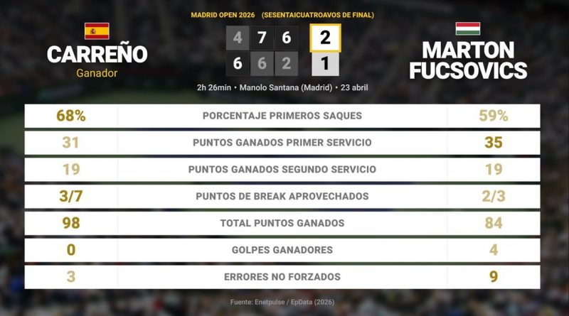 La inercia positiva se trasladó al tercer y último set. Con la confianza renovada y el apoyo del público, Pablo Carreño desplegó un tenis más agresivo y preciso. El asturiano rompió el servicio de su rival en varias ocasiones y no dio opción a Fucsovics, cerrando el partido con un contundente 6-2 que sellaba su clasificación para la siguiente ronda del prestigioso torneo madrileño.